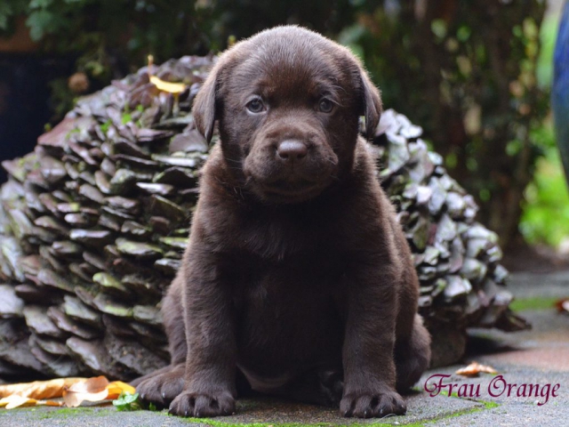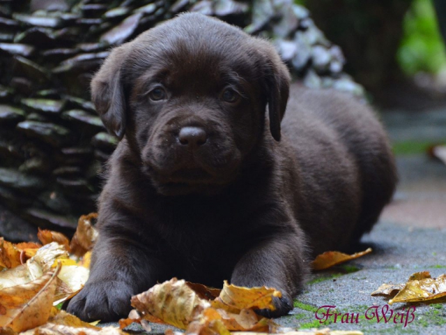 Wir erwarten aktive, sehr knochenstarke, kompakte Welpen, mit superschönen Köpfen in dunklem (zartbitter) chocolate.