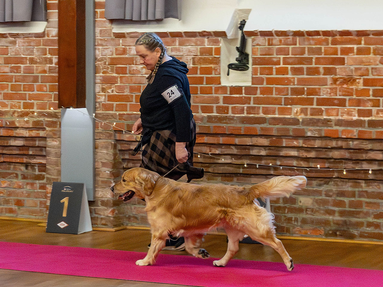 Er hat ein wunderschönes dunklgoldenes Haarkleid, von eher glatter Strucktur, eine gute knochenstärke, excellente Vor- sowie Hinterhand Winkellungen und super Pigment. Alles in allem ein Traum von Golden Retriever